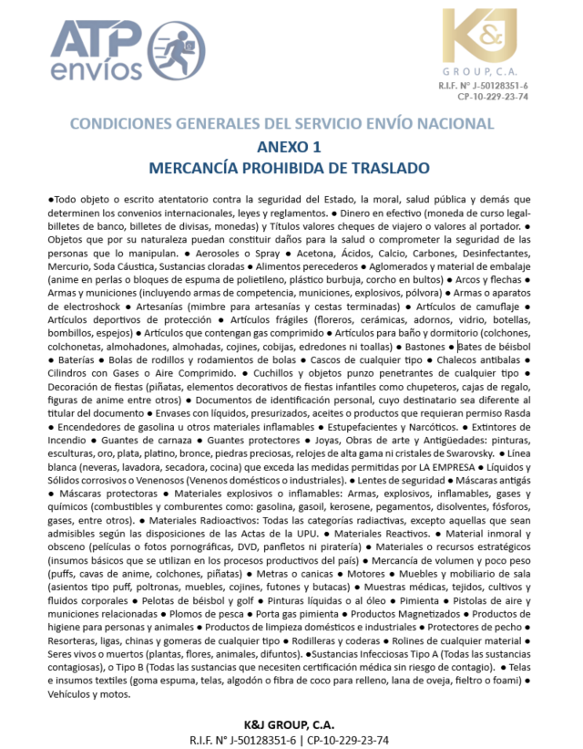Por regulaciones nacionales e internacionales, están prohibidos artículos como explosivos, armas, dinero en efectivo, materiales inflamables, entre otros, los cuales puedes precisar en nuestro listado de Mercancía Prohibida de Traslado.